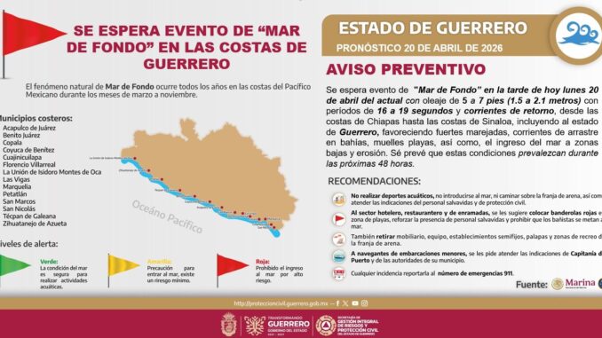 Chilpancingo, Gro., 20 de abril de 2026.- La Secretaría de Gestión Integral de Riesgos y Protección Civil informó que a partir de la tarde de este lunes se prevé la presencia de un nuevo evento de Mar de Fondo, fenómeno marítimo que favorecerá la manifestación de oleaje de 1.5 a 2.1 metros de altura en toda la franja costera del estado.