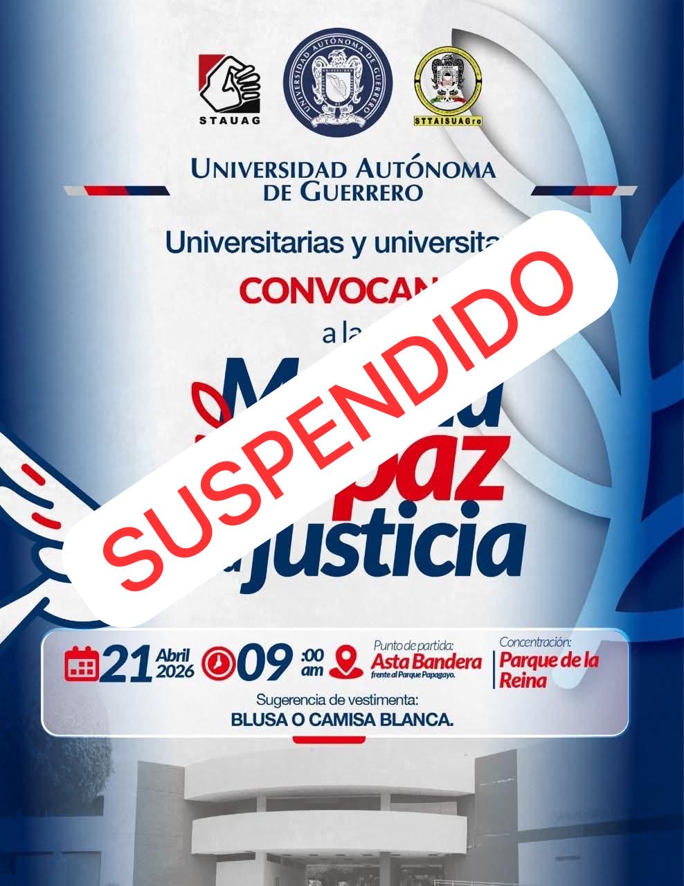 Sin embargo, a través de redes sociales, Brenda Alicia Alcaraz González, Secretaria General del Sindicato de Trabajadores Técnicos, Administrativos y de Intendencia al Servicio de la UAGro (STTAISUAGro), informaba que, tras un diálogo entre el rector Javier Saldaña Almazán y la Fiscalía General del Estado, además de acuerdos tomados, se decidió suspender la movilización.