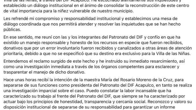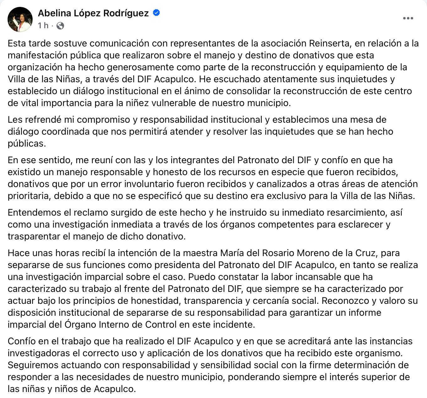 A través de un comunicado difundido en redes sociales, López Rodríguez informó que ya mantiene comunicación con representantes de Reinserta para aclarar el manejo y destino de los donativos entregados como parte de la reconstrucción del inmueble tras el paso del huracán Otis.